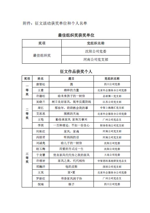 为结合“学党章党规、学系列讲话,做合格党员”学习教育活动,以传承、展示优良家风为载体,以激发党员崇德向善、争做合格党员为目的,中智集团党委于2016年5月至9月开展了关于家风家教的主题征文活动。活动开展以来,各级党组织广泛动员,党员群众积极响应,踊跃投稿,共收到稿件258篇。通过层层筛选确定初选作品后,又经大众投票评选出入围奖项的18篇文章,最终经评审组严格按照评选标准,逐一评审,坚持好中选优的原则,评出一等奖3篇、二等奖5篇、三等奖10篇。根据各党组织的投稿情况,评审组评定最佳组织奖2名。现决定对获奖的单位和个人进行表彰奖励,以资鼓励。