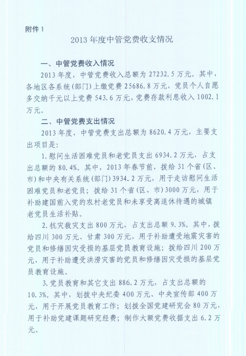 中智公司全体党员同志们: 根据中组织部、国资委党建局的指示要求,现将《2013年度中管党费收支情况》和《2013年度国资委党委党费收支情况》于11月5日至11月12日期间进行公示。 请知晓、关注。 中智党委组织部 2014年11月5日 附件一: