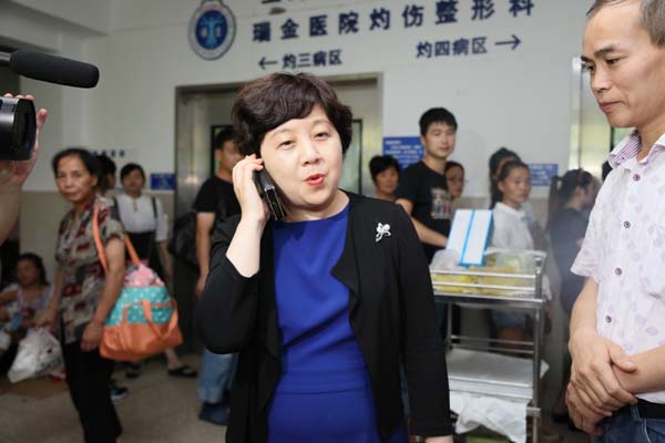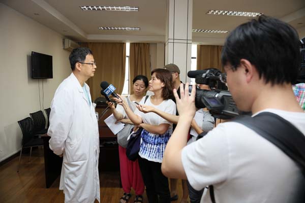 | 瑞金医院灼伤整形科主任医师张勤正在介绍王海滨的最新伤情情况 |