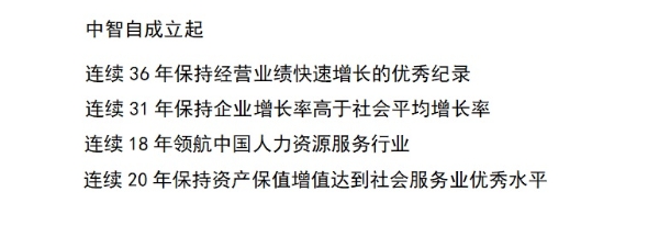 2005年起,中智荣登由中国企业联合会、中国企业家协会颁布的中国服务业企业500强;获亚太人力资源研究协会、《财智》杂志“最佳HR综合服务机构奖”